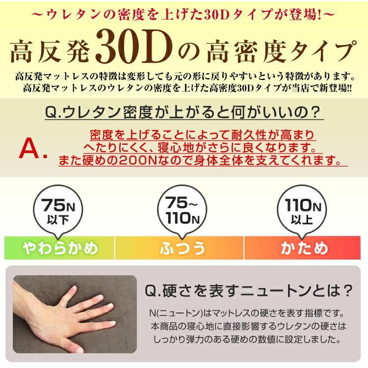 高密度30D!こだわりの硬さ200N! 厚みたっぷり10cm! 適度な硬さで身体をしっかり支える、高反発マットレスです。
